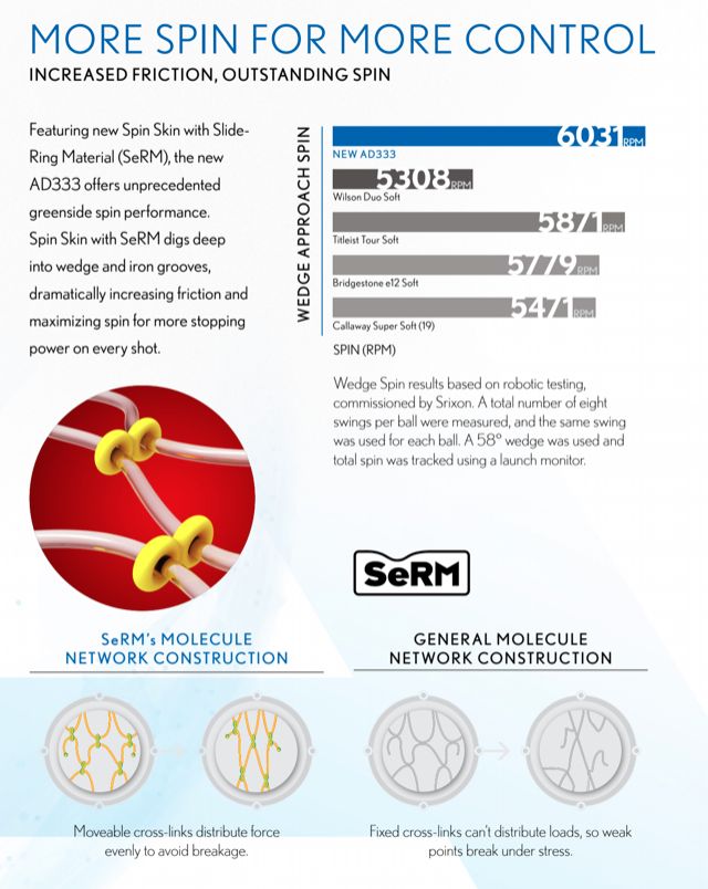 Featuring new Spin Skin with Slide-Ring Material, the new AD333 offers unprecedented greenside spin performance. Spin Skin with SeRM digs deep into Wedge and Iron grooves, dramatically increasing friction and maximizing spin for more stopping power on every shot.