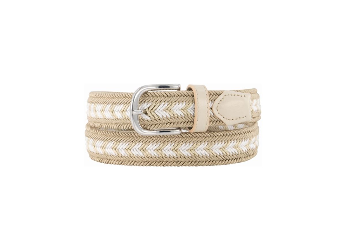 Braided stretch textile belt from Italy, with silver pin buckle and discreetly discreet embossed labeling on the leather loop. The belt offers