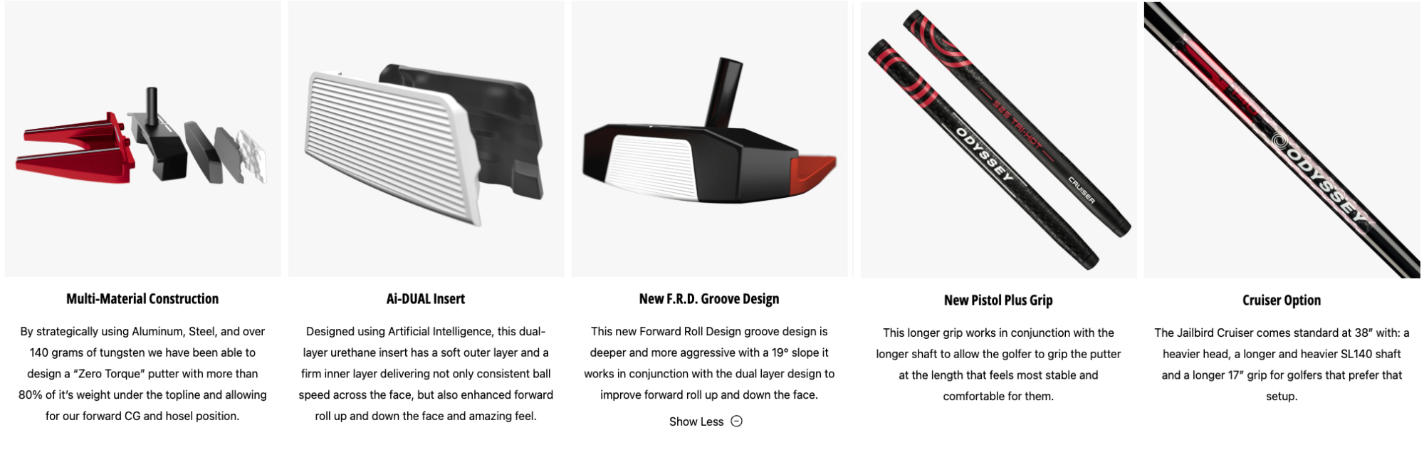 A breakthrough in Zero-Torque putter design, Odyssey’s all-new S2S TRI-HOT multi-material construction advances the Zero-Torque category by eliminating shaft lean and positioning the shaft closer to the face than other putters in it’s class. The S2S TRI-HOT Jailbird Cruiser is configured with a longer, heavier shaft providing counterbalance with a heavier head to maximize MOI, enhance stability, and promote a consistent and repeatable stroke. This model also features Odyssey’s most advanced insert ever, the two-layer urethane Ai-DUAL design delivers consistent ball speed across the face and improved forward roll.