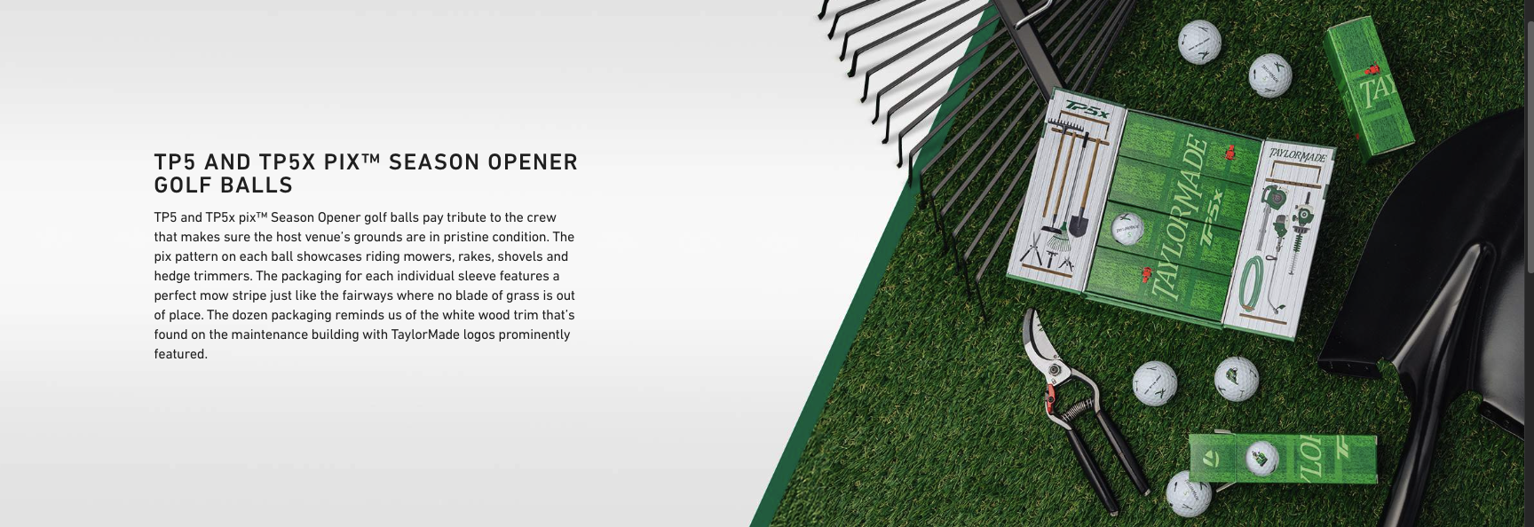 TP5 and TP5x pix™ Season Opener golf balls pay tribute to the crew that makes sure the host venue’s grounds are in pristine condition. The pix pattern on each ball showcases riding mowers, rakes, shovels and hedge trimmers.