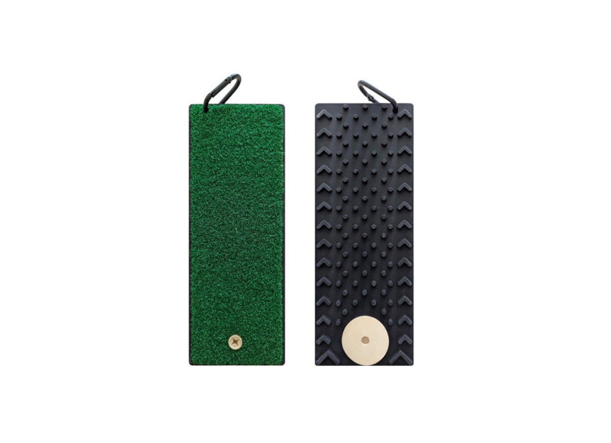 32 x 12 cms. Includes carabiner clip for attachment onto golf bag / holdall. Non-slip, weighty base