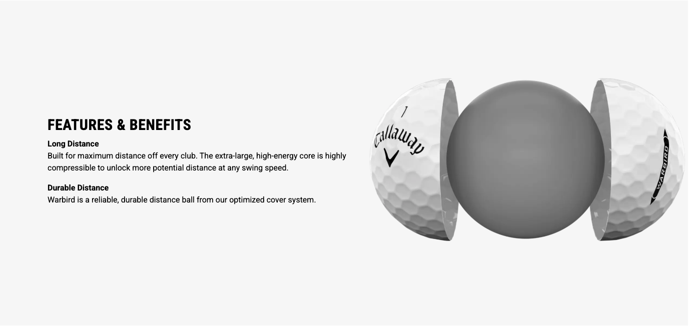 Callaway’s Warbird Distance+ is a distance ball that creates maximum speed from an extra-large, high energy core, and a 2-piece construction. This durable design promotes high launch and long carry from our HEX Aerodynamics, with impressive feel and control to complement all that distance.