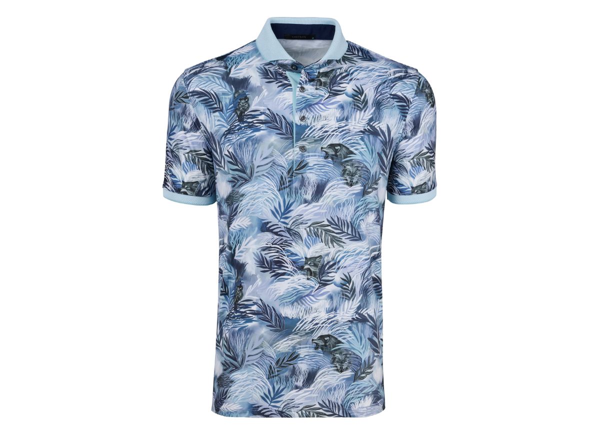 The Wolf Palm Polo delivers a modern seasonal pattern on luxurious fabric for a refined look. Designed with breathability, quick-drying, and four-way stretch, this performance printed polo moves with you throughout the day. The four-button placket and a jacquard knit collar and cuffs in contrast baby blue elevate the style.